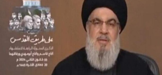 كلام السيد نصرالله جاء خلال الاحتفال بالذكرى الرابعة لاستشهاد الحاج قاسم سليماني وأبو مهدي المهندس الذي يقيمه حزب الله في مجمع سيّد الشهداء في الضاحية الجنوبية لبيروت، حيث جدّد السيد نصر الله “تبريكنا وتعازينا بشهادة أصحاب المناسبة في هذا اليوم بالشهيد القائد الكبير قاسم سليماني ورفاقه من الشهداء الايرانيين والشهيد القائد الكبير الحاج ابو مهدي المهندس واخوانه أيضًا”، كما توجه الى “عائلات الذين استشهدوا في جوار المرقد الطاهر للشهيد سليماني في كرمان”، معتبرًا أنّ “هؤلاء استشهدوا في نفس الطريق الذي مضى عليه القائد سليماني”.