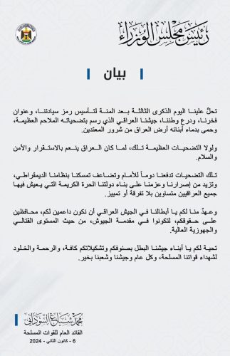 السوداني: لولا التضحيات العظيمة للجيش لما كان العراق ينعم بالاستقرار والأمن والسلام
