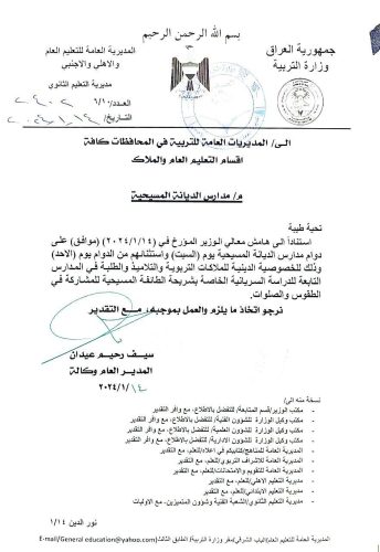 وذكر بيان لوزارة التربية، أن “وزير التربية إبراهيم نامس الجبوري، وافق على دوام مدارس الديانة المسيحية يوم السبت واستثنائها من الدوام يوم الأحد”.