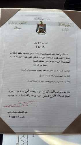 بالوثيقة .. صدور مرسوم جمهوري بشأن تعيين اسعد العيداني محافظا للبصرة