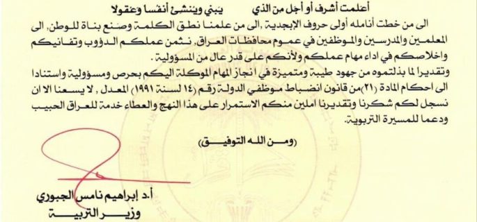 بمناسبة عيد المعلم.. وزير التربية يهدي كتاب شُكر وتقدير للهيئات التعليمية والتدريسية والإدارية