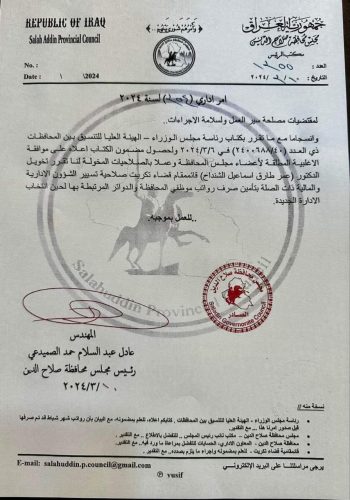 بالوثيقة :مجلس محافظة صلاح الدين يكلف قائممقام تكريت بمهام المحافظ الادارية والمالية