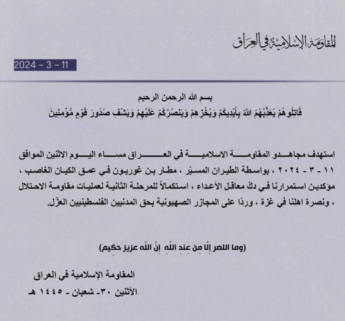 استهدف مجاهدو المقاومة الاسلامية في العراق مساء الاثنين الموافق 11 – 3 – 2024، بواسطة الطيران المسيّر، مطار بن غوريون في عمق الكيان الغاصب، مؤكدين استمرارنا في دكّ معاقل الأعداء، استكمالًا للمرحلة الثانية لعمليات مقاومة الاحتلال، ونصرة أهلنا في غزة، وردًا على المجازر الصهيونية بحق المدنيين الفلسطينيين العزّل.