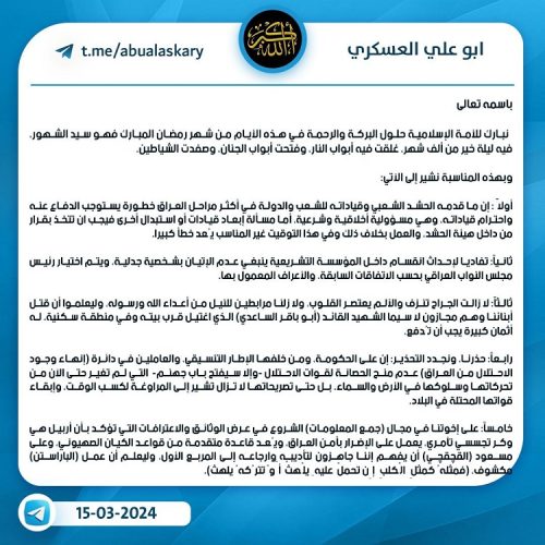 وقال أبو علي العسكري في بيانه: “نبارك للأمة الإسلامية حلول البركة والرحمة في هذه الأيام من شهر رمضان المبارك فهو سيد الشهور فيه ليلة خير من ألف شهر، غلقت فيه أبواب النار، وفتحت أبواب الجنان، وصفدت الشياطين”.
