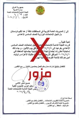 التربية تنفي كتاباً مزوراً يخص تأجيل الامتحانات الوزارية للصف السادس الإعدادي
