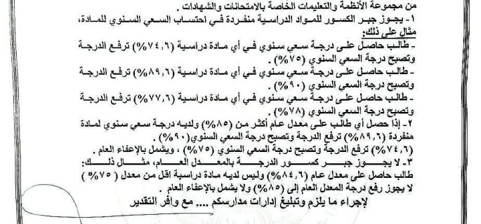 بالوثيقة : التربية توضح آلية وكيفية جبر كسور الدرجات في حالة الإعفاء العام والفردي