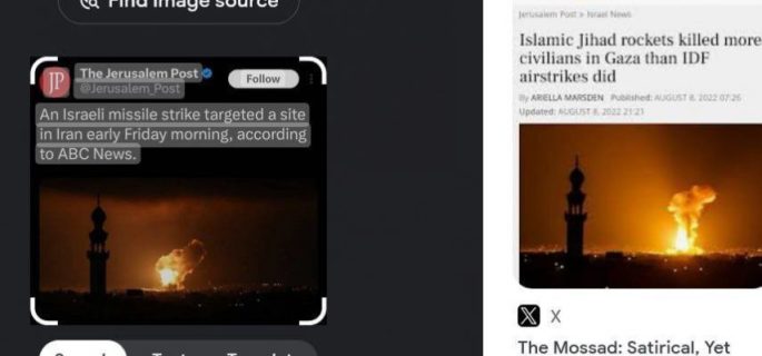 نشرت صحيفة “جيروزاليم بوست” العبرية تغريدة مرفق بصورة مزيفة حيث زعمت انها تعود “لإستهدف موقعا في إيران بهجوم صاروخي في الصباح الباكر”.