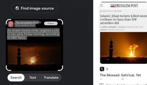 نشرت صحيفة “جيروزاليم بوست” العبرية تغريدة مرفق بصورة مزيفة حيث زعمت انها تعود “لإستهدف موقعا في إيران بهجوم صاروخي في الصباح الباكر”.