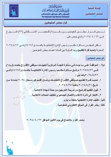 بالوثيقة : مفوضية الانتخابات تمدد فترة التقديم لموظفي الاقتراع لانتخابات برلمان الاقليم