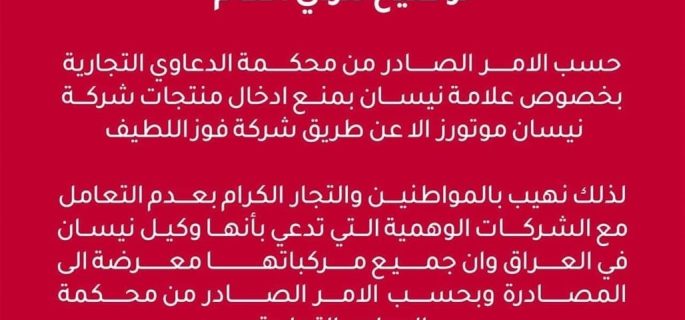 دعت الوكيل الحصري لشركة نيسان في العراق، الى عدم التعامل مع أي شركة أخرى بعد صدور أمر ولائي بهذا الشأن.