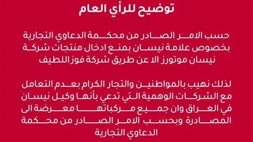 دعت الوكيل الحصري لشركة نيسان في العراق، الى عدم التعامل مع أي شركة أخرى بعد صدور أمر ولائي بهذا الشأن.