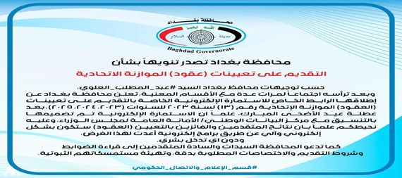 ه “حسب توجيهات محافظ بغداد عبد المطلب العلوي، وبعد ترؤسه اجتماعاً لمرات عدة مع الأقسام المعنية، تعلن محافظة بغداد عن إطلاقها الرابط الخاص للاستمارة الإلكترونية الخاصة بالتقديم على تعيينات (العقود) الموازنة الاتحادية رقم (١٣) لسنة ٢٠٢٣ للسنوات (٢٠٢٣، ٢٠٢٤، ٢٠٢٥)، بعد عطلة عيد الأضحى المبارك”.