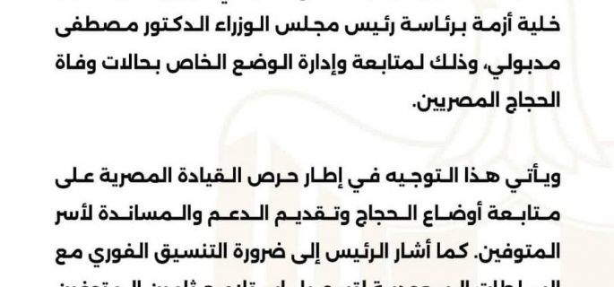 أصدر الرئيس عبد الفتاح السيسي توجيهاته بتشكيل خلية أزمة برئاسة رئيس الوزراء الدكتور مصطفى مدبولي لمتابعة وإدارة الوضع الخاص بحالات وفاة الحجاج المصريين.