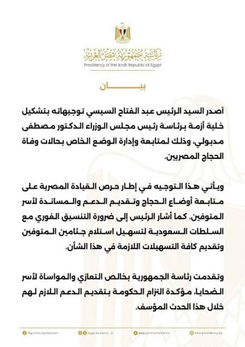 أصدر الرئيس عبد الفتاح السيسي توجيهاته بتشكيل خلية أزمة برئاسة رئيس الوزراء الدكتور مصطفى مدبولي لمتابعة وإدارة الوضع الخاص بحالات وفاة الحجاج المصريين.