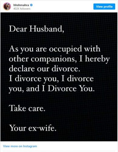 وقالت مهرة، في حسابها بانستغرام، “الزوج العزيز، بما أنك مشغول برفقة آخرين، أعلن بموجب هذا طلاقنا. أنا أطلقك، أنا أطلقك، وأنا أطلقك. اعتن بنفسك. زوجتك السابقة”.