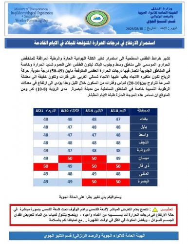 الأنواء الجوية: استمرار ارتفاع درجات الحرارة خلال الأيام المقبلة ونحذر بعدم التعرض المباشر لأشعة الشمس