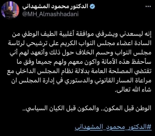 أعلن النائب محمود المشهداني، اليوم الأحد، حسم خلاف رئاسة البرلمان وموافقة الأغلبية على ترشيحه للمنصب.وقال المشهداني، عبر منصة “إكس”: “إنه ليسعدني ويشرفني موافقة أغلبية الطيف الوطني للمكون من اعضاء مجلس النواب على ترشيحي لرئاسة مجلس النواب وحسم الخلاف حول ذلك”.