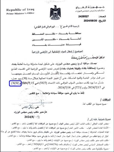 وجاء في وثيقة صادرة من مكتب رئيس الوزراء بتاريخ 20 آب/ أغسطس الجاري، أنه “حصلت موافقة رئيس مجلس الوزراء على تشكيل لجنة مشتركة برئاسة أمانة بغداد وعضوية (محافظة بغداد وقيادة عمليات بغداد) لغرض تحديد الأراضي الزراعية التي اكتسبت الطابع السكني”.