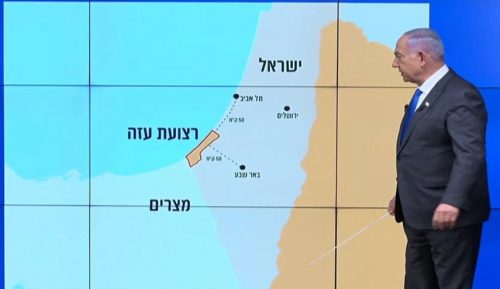 وتحدث خلال مؤتمر صحفي عن أهمية سيطرة الجيش الإسرائيلي على محور فيلادلفيا الحدودي بين قطاع غزة ومصر، لكن خلو الخريطة من أي إشارة إلى الضفة كان لافتا.