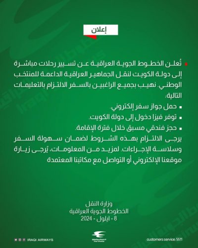 الخطوط الجوية: تسيير رحلات مباشرة إلى الكويت لنقل الجماهير العراقية