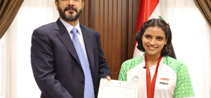 وأضافت أن “وزير التعليم هنأ صاحبة الوسام الذهبي التاريخي نجلة عماد وسلمها الأمر الوزاري بقبولها في كلية التربية البدنية وعلوم الرياضة بجامعة ديالى ضمن قناة القبول المباشر لفئة الأبطال تكريما لفوزها بالميدالية الذهبية في منافسات تنس الطاولة ضمن الألعاب البارالمبية في باريس 2024”.