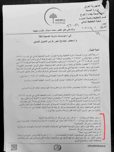 وجاء في وثيقة صادرة عن الوزارة، أن هيئة الرأي قررت، بناء على مقتضيات المصلحة العامة ولغرض توفير المستلزمات اللازمة للخدمات الصحية في المؤسسات الحكومية، العمل بالرسوم الجديدة في المستشفيات والمراكز التخصصية ومراكز الرعاية الصحية الأولية اعتبارا من الأول من تشرين الأول المقبل لعام 2024. انتهى