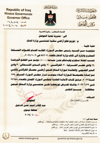 وجاء في وثيقة صادرة من محافظ نينوى عبد القادر الدخيل، “بتوجيه من القائد العام للقوات المسلحة رئيس الوزراء وإشارة الى كتاب وزارة الدفاع تنسب اتخاذ ما يلزم وقيام بلدية الموصل بفرز مساحة 100 دونم من القطع المرقمة (7/ وادي حجر الشرقية ، 2/ الغزلاني ، 6/ وادي الدير الشمالي ، 9/وادي الدير الجنوبي) والعائدة لوزارة الدفاع ضمن أراضي معسكر الغزلاني والتي تمت إعادة تخصيصها للوزارة أعلاه بموجب قرار مجلس الوزراء المرقم 179 لسنة 2022، لغرض توزيعها بين منتسبي وزارة الدفاع ضمن محافظة نينوى”.انتهى