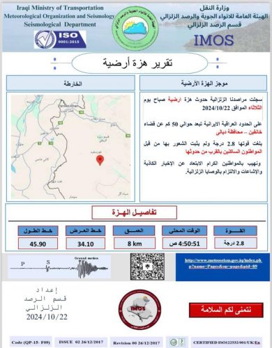 وقالت الهيئة في بيان تلقت *الرأي* الدولية نسخه منه، ان “مراصدنا الزلزالية سجلت حدوث هزة ارضية صباح يوم الثلاثاء، على الحدود العراقية الايرانية تبعد حوالي 50 كم عن قضاء خانقين – محافظة ديالي بلغت قوتها 2.8 درجة”.