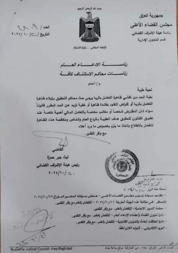 جاء ذلك وفقا لكتاب مذيل بتوقيع رئيس هيئة الاشراف القضائي القاضي ليث جبر حمزة بتاريخ العشرين من شهر تشرين الأول/أكتوبر الجاري.