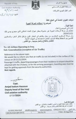 وأفادت وثيقة صادرة عن سلطة الطيران المدني ومرسلة إلى شركات الطيران العاملة في العراق، أنه “تم استثناء حركة الرحلات الجوية من حظر التجوال، وأن الرحلات المغادرة والقادمة إلى العراق لن تتأثر بهذا الحظر”.