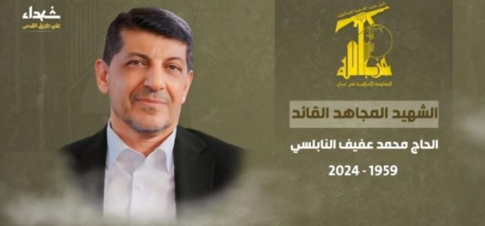 ننعى إلى أمة المقاومة والإعلام المقاوم، وأمة الشهداء والمجاهدين، قائدًا إعلاميًا كبيرًا وشهيدًا عظيمًا على طريق القدس، الحاج محمد عفيف النابلسي، مسؤول العلاقات الإعلامية في حزب الله، والذي ارتحل إلى جوار ربه مع خيرة من إخوانه المجاهدين في غارة صهيونية إجرامية عدوانية، بعد مسيرة مشرّفة في ساحات الجهاد والعمل الإعلامي المقاوم.