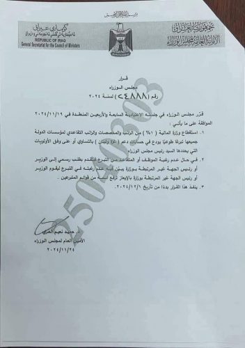 نص توجيه مجلس الوزراء للمالية لاستقطاع 1% من رواتب الموظفين دعماً لغزة ولبنان.