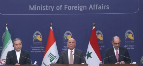 أكد وزراء خارجية العراق وسوريا وإيران، اليوم الجمعة، أهمية محاربة الإرهاب دولياً وحفظ أمن المنطقة ودعم الجهود الدبلوماسية لتهدئة الأوضاع في سوريا، مبينين أن ما يحدث حالياً سينعكس على أمن المنطقة بأكملها.