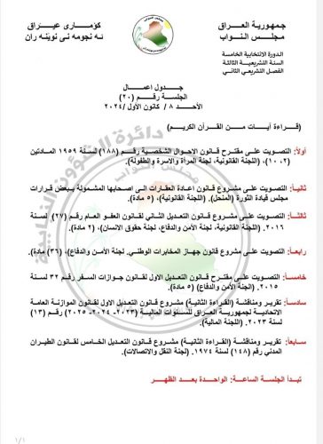 وذكرت الدائرة الإعلامية في بيان- تلقت*الرأي* الدولية نسمخه منه- أن “جدول أعمال الجلسة ليوم غد الأحد، تضمن عددا من مشاريع القوانين، أهمها التصويت على مقترح قانون الأحوال الشخصية، والتصويت على مشروع قانون التعديل الثاني لقانون العفو العام”.انتهى