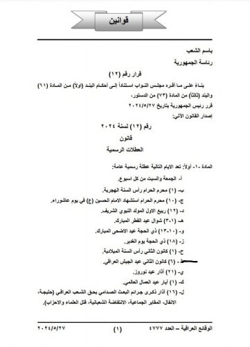 يشهد الأسبوع القادم عطلة رسمية يوم الاثنين المقبل بمناسبة ذكرى تأسيس الجيش العراقي الباسل وفقا لقانون العطل الرسمية رقم 12 لسنة 2024.