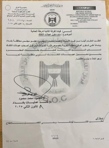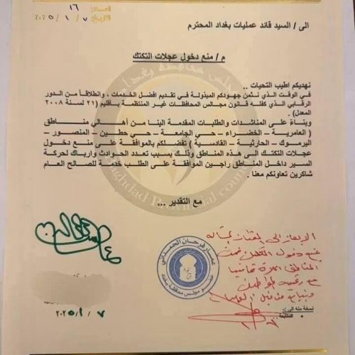 وبحسب وثائق رسمية، أنه “تقرر منع دخول عجلات الـ(تك تك) إلى مناطق: الحرية، العامرية، الخضراء، حي الجامعة، حي حطين، المنصور، اليرموك، الحارثية، والقادسية في العاصمة بغداد”.