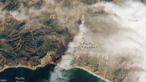 واستمر دخان حريق باليساديس في التدفق نحو المحيط الهادئ، حيث التقط قمر ناسا الاصطناعي “أكوا” صورا لأعمدة الدخان تتحرك بعيدا عن الساحل حيث التهم الحريق أكثر من 11000 فدان في اليوم الأول.