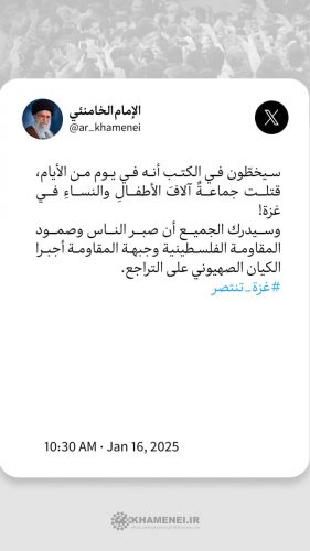 وجاء في التغريدة : “سيخطّون في الكتب أنه في يوم من الأيام، قتلت جماعةٌ آلافَ الأطفالِ والنساءِ في غزة!” وسيدرك الجميع أن صبر الناس وصمود المقاومة الفلسطينية وجبهة المقاومة أجبرا الكيان الصهيوني على التراجع”.