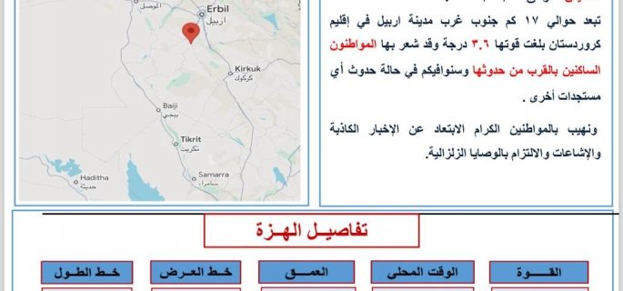 وذكر تقرير للأنواء الجوية والرصد الزلزالي، تلقت *الرأي8 الدولية نسخه منه، ان “الهزة بلغت قوتها 3.6 درجة على مقياس ريختر، وتبعد حوالي 17 كم جنوب غربي أربيل”.