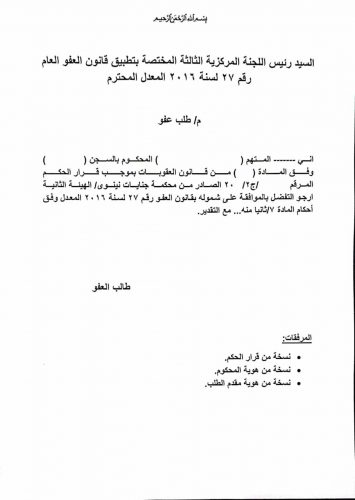 وذكر المصدر، أن “الطلبات يمكن تقديمها من المحكوم نفسه أو وكيله القانوني أو أحد أفراد أسرته من الأب أو الأم أو الأولاد وحتى الأزواج والأحفاد والإخوة”، مؤكدة “ضرورة إرفاق هوية مقدم الطلب وصورة مصورة من الحكم الصادر بحق المحكوم”.