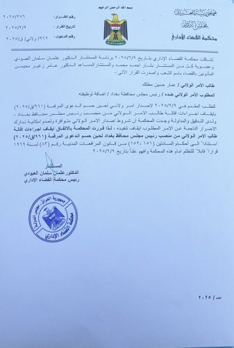 بالوثيقة : إيقاف إجراءات إقالة عمار القيسي وإعادته رئيسًا لمجلس محافظة بغداد