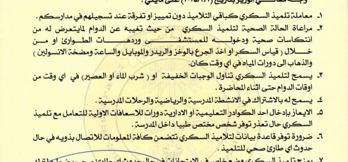 التربية تصدر توجيها يقضي بمراعاة مرضى السكري داخل الصفوف الدراسية