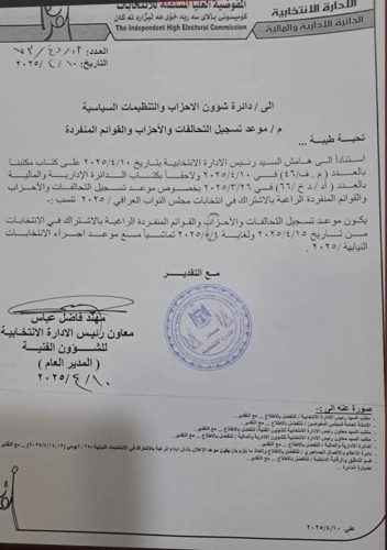 وقالت المفوضية ، انه “استنادا الى هامش رئيس الادارة الانتخابية بتاريخ 10 نيسان الحالي ولاحقاً بكتاب الدائرة الإدارية والمالية بخصوص موعد تسجيل التحالفات والأحزاب والقوائم المنفردة الراغبة بالاشتراك في انتخابات مجلس النواب العراقي 2025، تنسب: