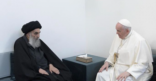وأضاف “وقد كان اللقاء التاريخي الذي جمعه بالمرجع الديني الأعلى في النجف محطة فائقة الأهمية لتأكيد الطرفين على الدور الأساس للإيمان بالله تعالى وبرسالاته والالتزام بالقيم الأخلاقية السامية في التغلب على التحديات الكبيرة التي تواجهها الانسانية في هذا العصر، وضرورة تضافر الجهود في سبيل تعزيز ثقافة التعايش السلمي ونبذ العنف والكراهية، وتثبيت قيم التآلف بين الناس المبني على رعاية الحقوق والاحترام المتبادل بين معتنقي مختلف الأديان والاتجاهات الفكرية”.