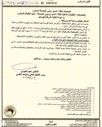 التعليم تقرر السماح بإعادة الطلبة المرقنة قيودهم إلى مقاعد الدراسة