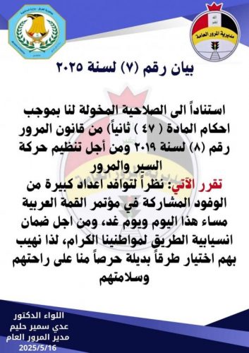 المرور توجه سائقي المركبات : اسلكوا طرقا بديلة