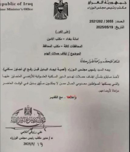 بالوثيقة.. السوداني يوجه بإيقاف إزالة العشوائيات الا بعد توفير بديل