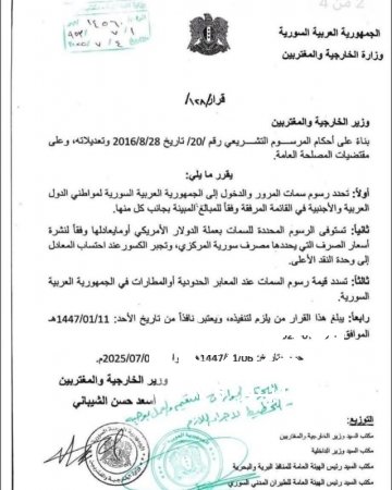 وأوضح القرار أن تسديد الرسوم سيتم بالدولار الأميركي أو ما يعادله وفق نشرة مصرف سوريا المركزي، وتُجبى عند المنافذ الحدودية أو في المطارات السورية.