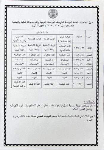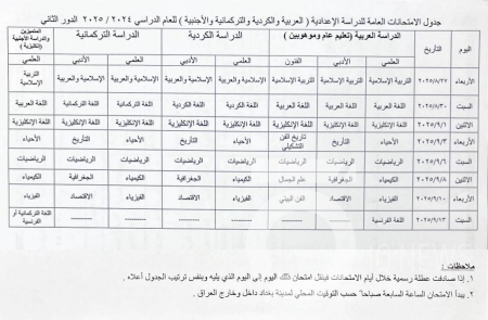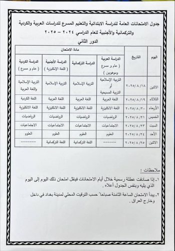 التربية تعلن جدول امتحانات الدور الثاني للابتدائية والمتوسطة والاعدادية