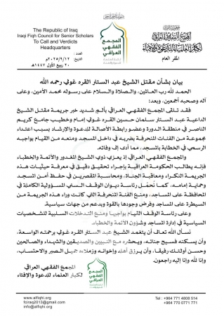 المجمع الفقهي يحمل الوقف السني جريمة مقتل إمام وخطيب جامع الدورة ويدعو إلى منع التدخلات السياسية بإدارة المساجد